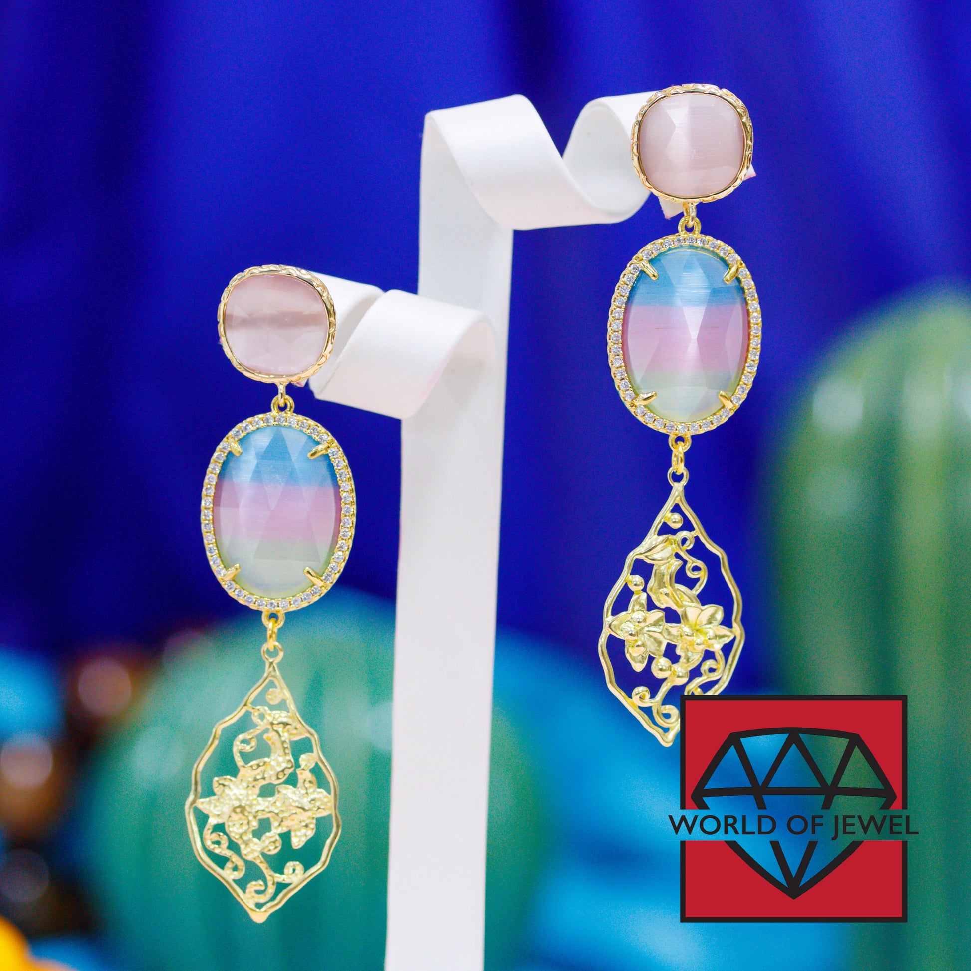 Elegant Bronze Earrings with Cat's Eye Cabochon and Gold Leaf