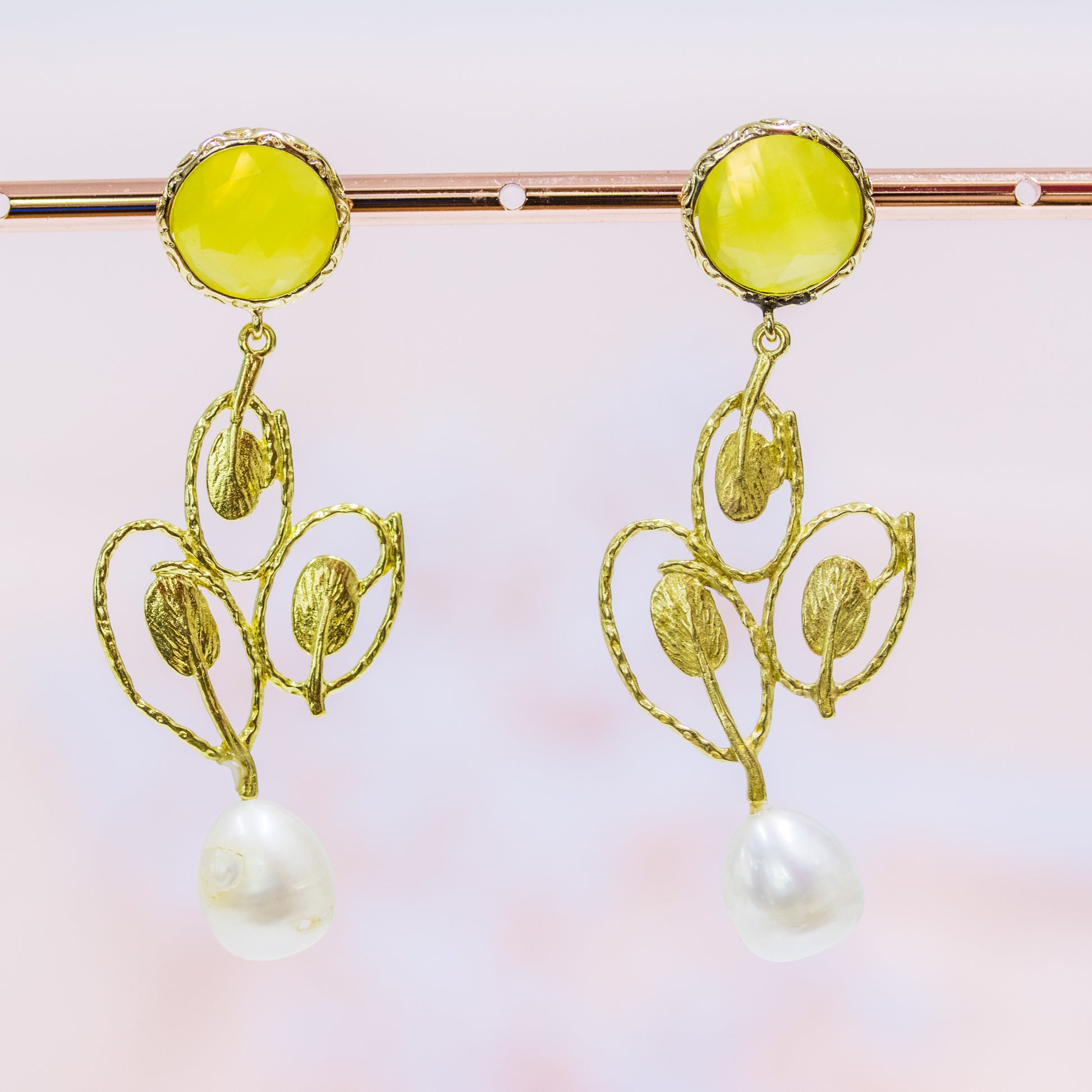 Add a touch of sophistication to your style with these unique earrings, crafted in bronze and enriched with cat's eye cabochons and yellow river pearls. Discover the elegance that speaks of you!