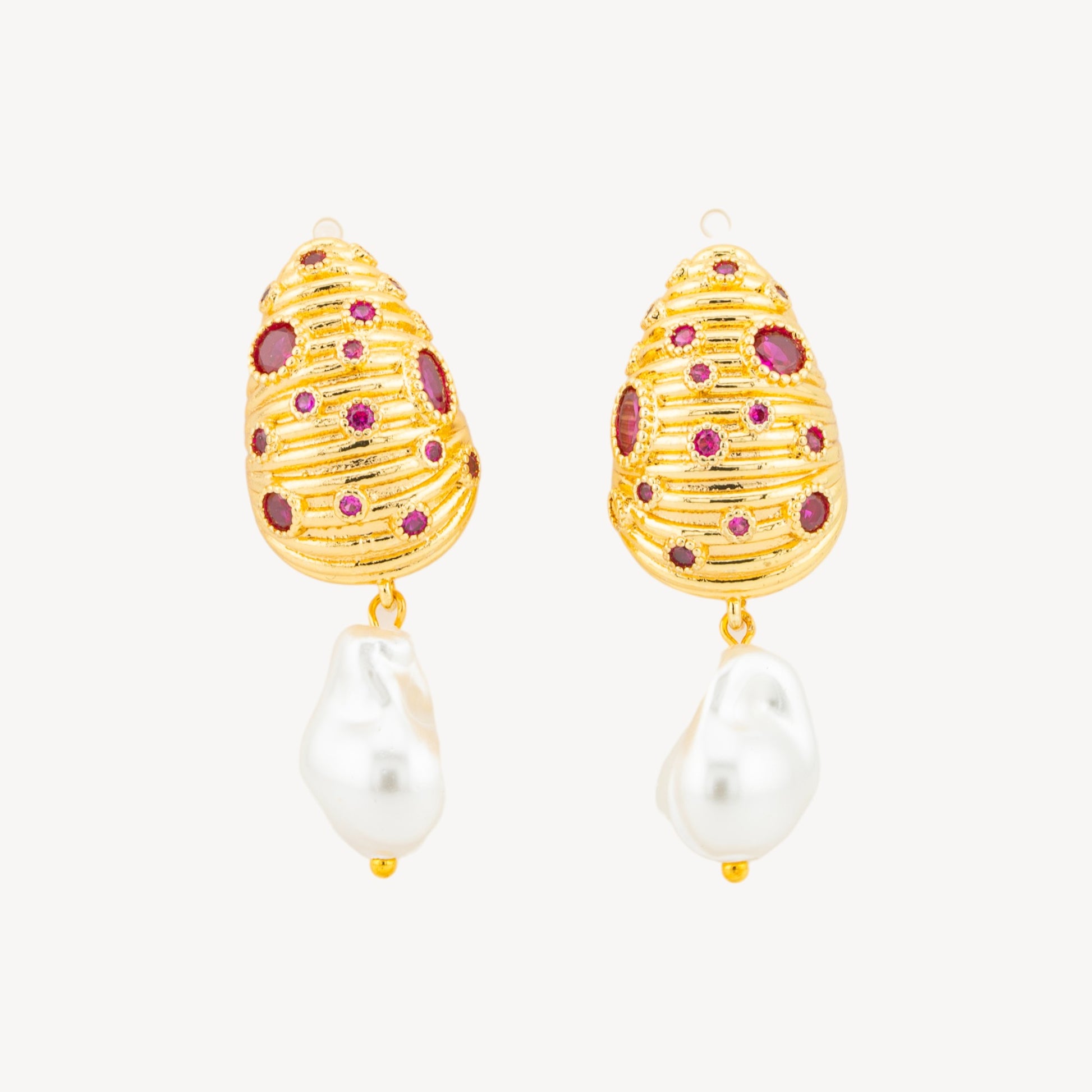 Baroque Elegance Earrings: Bronze Shell with Zirconia and Red Mallorca Pearls
