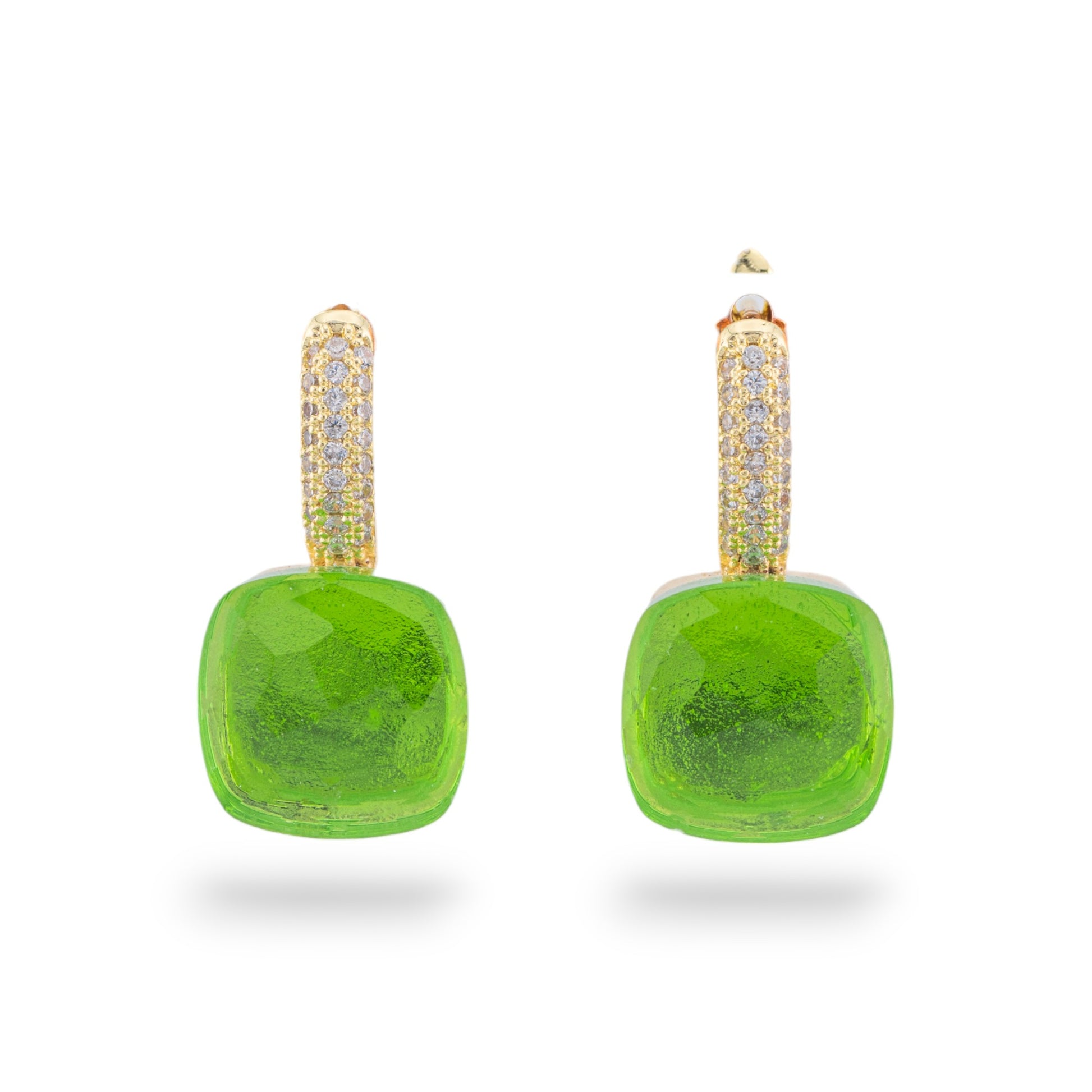 Scopri il fascino unico di questi orecchini in bronzo dorato. Il raffinato taglio cuscino dell'occhio di gatto e gli scintillanti zirconi cattureranno ogni sguardo, rendendoli un must-have per ogni amante del gioiello.
